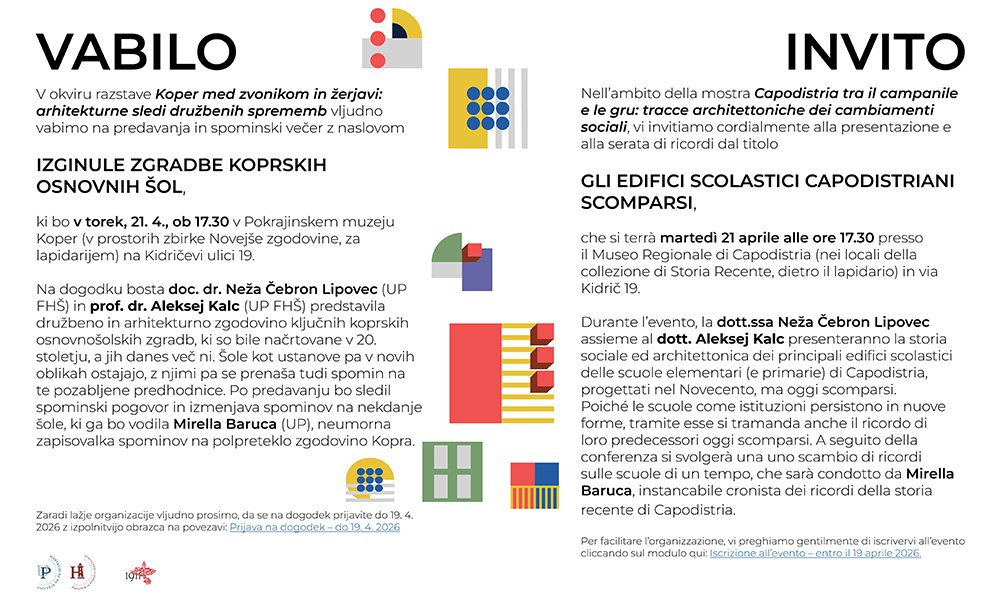 O družbeni in arhitekturni dediščini teh šol bosta spregovorila doc. dr. Neža Čebron Lipovec in prof. dr. Aleksej Kalc z Univerze na Primorskem (FHŠ). Predstavila bosta zgodovino ključnih šolskih objektov, načrtovanih v 20. stoletju, ki so skozi desetletja izginili iz mestnega prostora, a ostajajo pomemben del kolektivnega spomina.