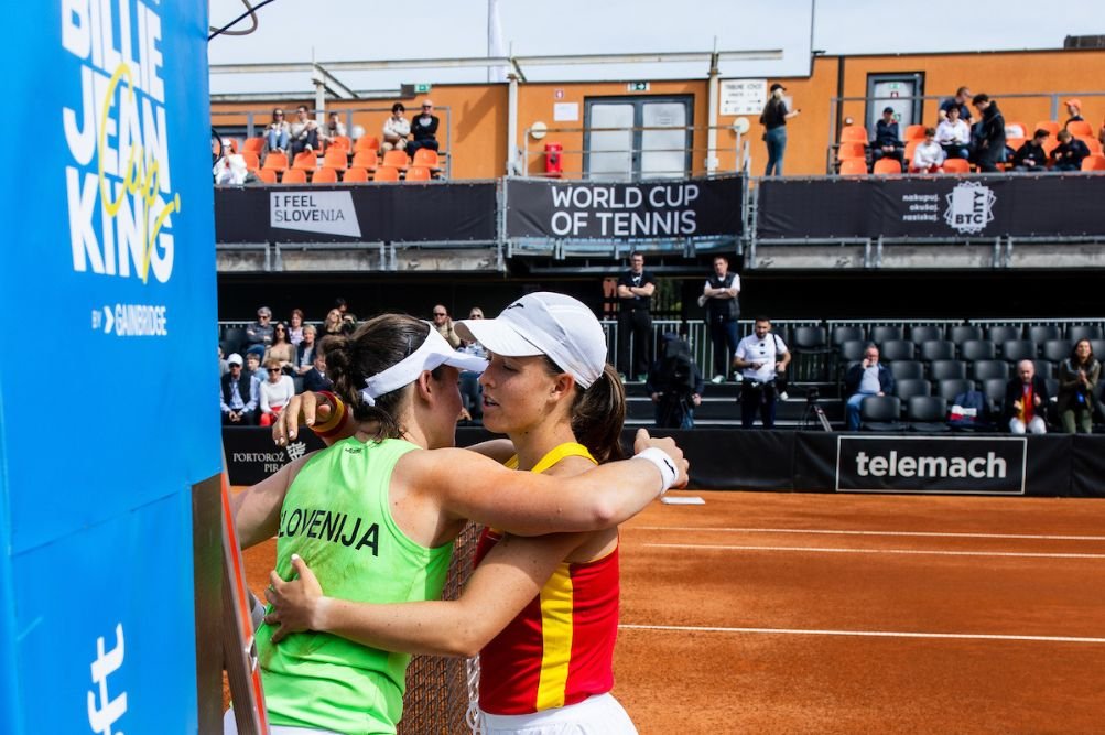 Slovenija in Španija bosta danes v Portorožu odigrali še tri partije, ki bodo določile enega od osmih udeležencev zaključnega turnirja teniškega pokala Bille Jean King. Rezultat po prvem dnevu je 1:1, Slovenija pa bo morala zmago napadati brez najizkušenejše igralke Tamare Zidanšek, ki si je v petek poškodovala gleženj.