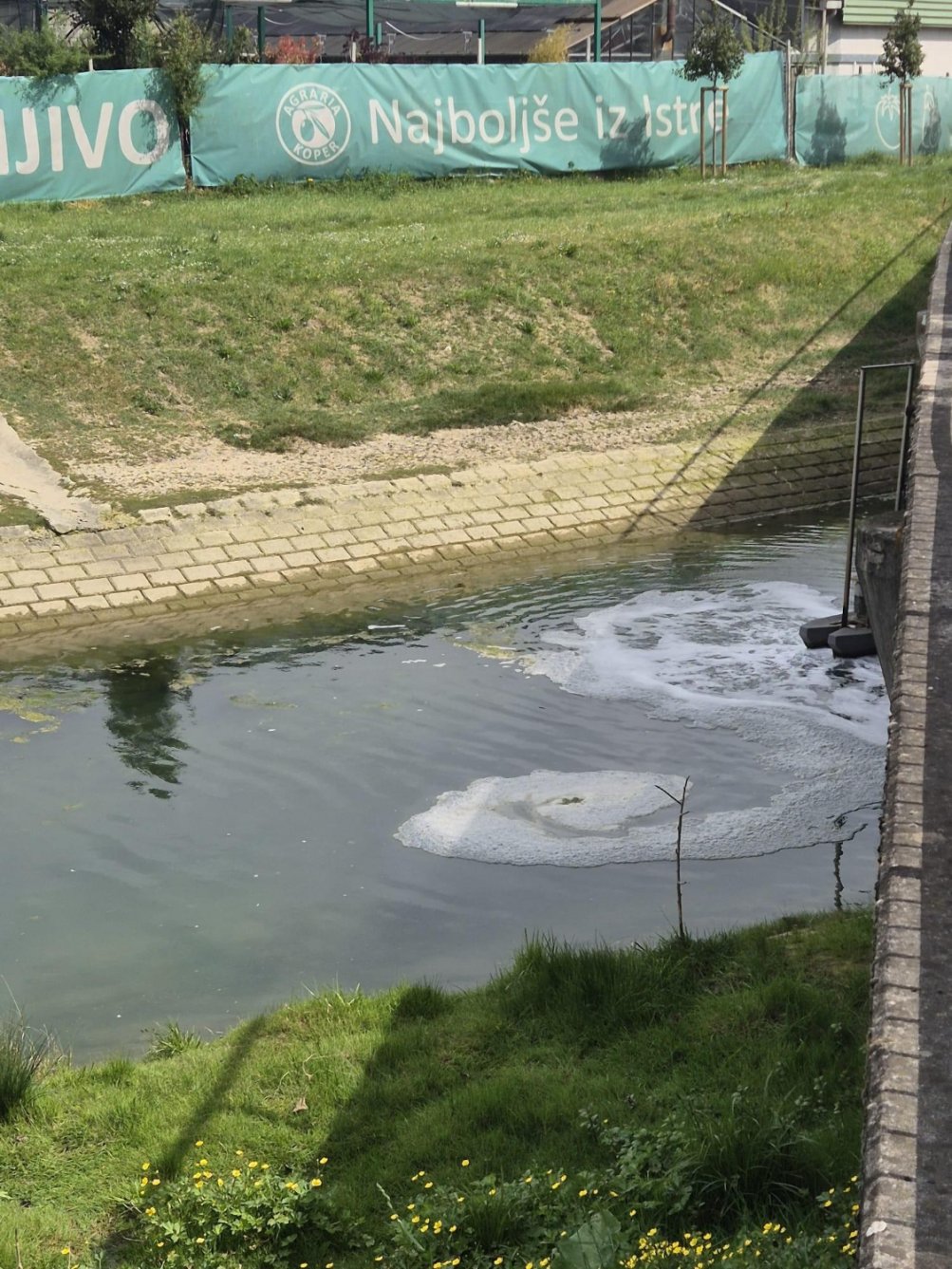 Bralec nam je poslal fotografijo akutnega onesnaženja Badaševice v neposredni bližini Agrarie Koper na območju Šalare. Kot se lahko razbere, so na vodi vidne fekalije in gosta bela pena, ki se vrtinči in nabira na površini, voda pa je motna in zelenkasta, kar po vsej verjetnosti kaže na prisotnost komunalnih odpadnih voda.