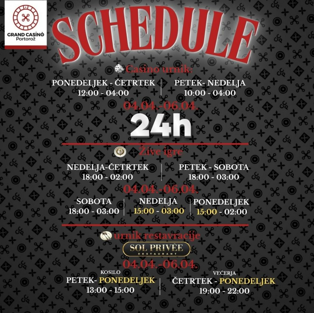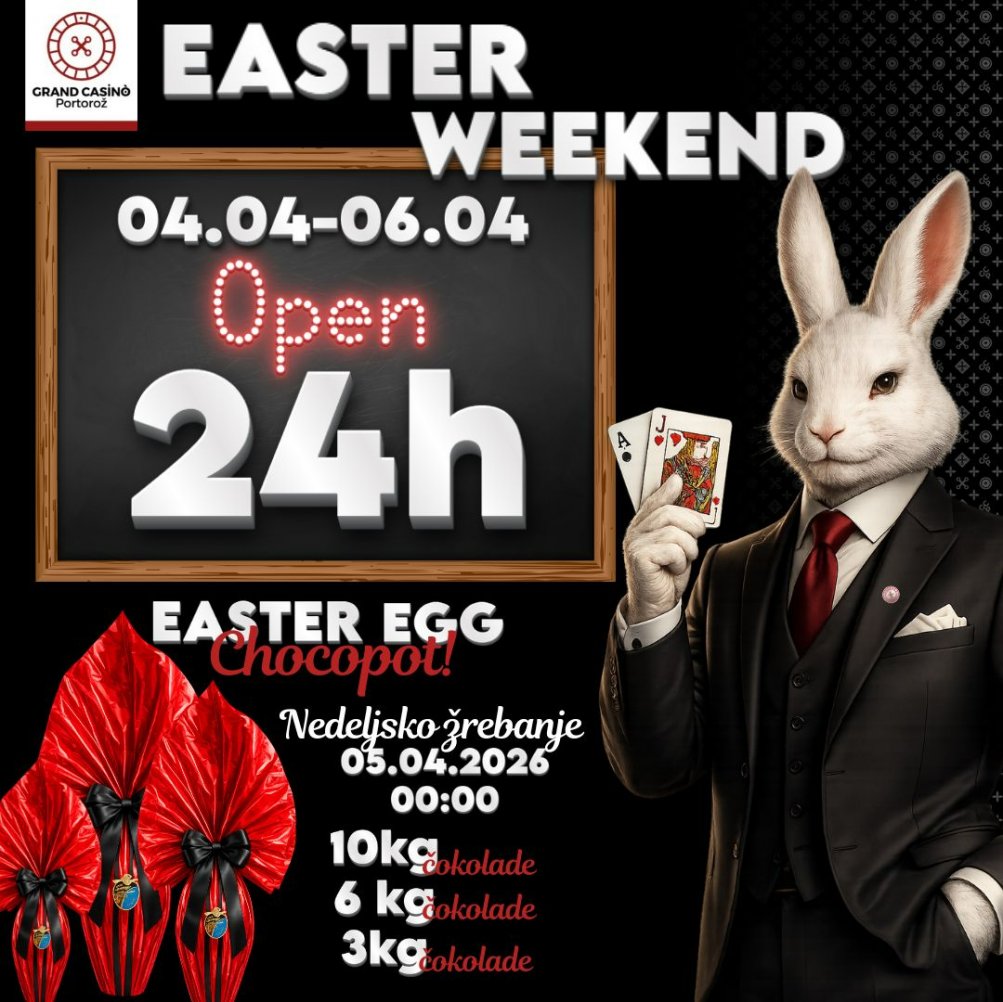 Velikonočni vikend bo letos še posebej praznično obarvan tudi zaradi podaljšanega obratovanja. Od 4. do 6. aprila 2026 bo Grand Casino Portorož odprt 24 ur na dan, neprekinjeno, kar obiskovalcem omogoča popolno svobodo pri načrtovanju obiska in uživanju v prazničnem dogajanju kadarkoli. V tem času bodo žive igre odprte že od 15. ure dalje, dodatno pa bo prazničnemu ritmu prilagojen tudi urnik restavracije.